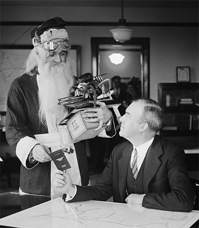 This photo shows Santa Claus receiving his pilot’s licence. The seated man holds the very first licence issued by this organisation.